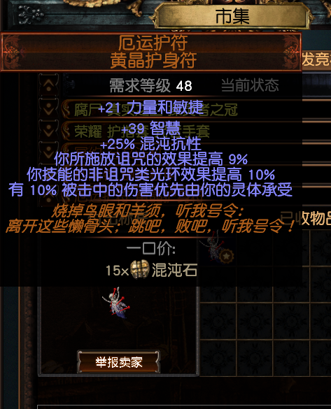 8、项链:厄运护符,可以给我们提供10%的减伤,任意属性就行,挑便宜的买,当然有10%非诅咒光环最好。