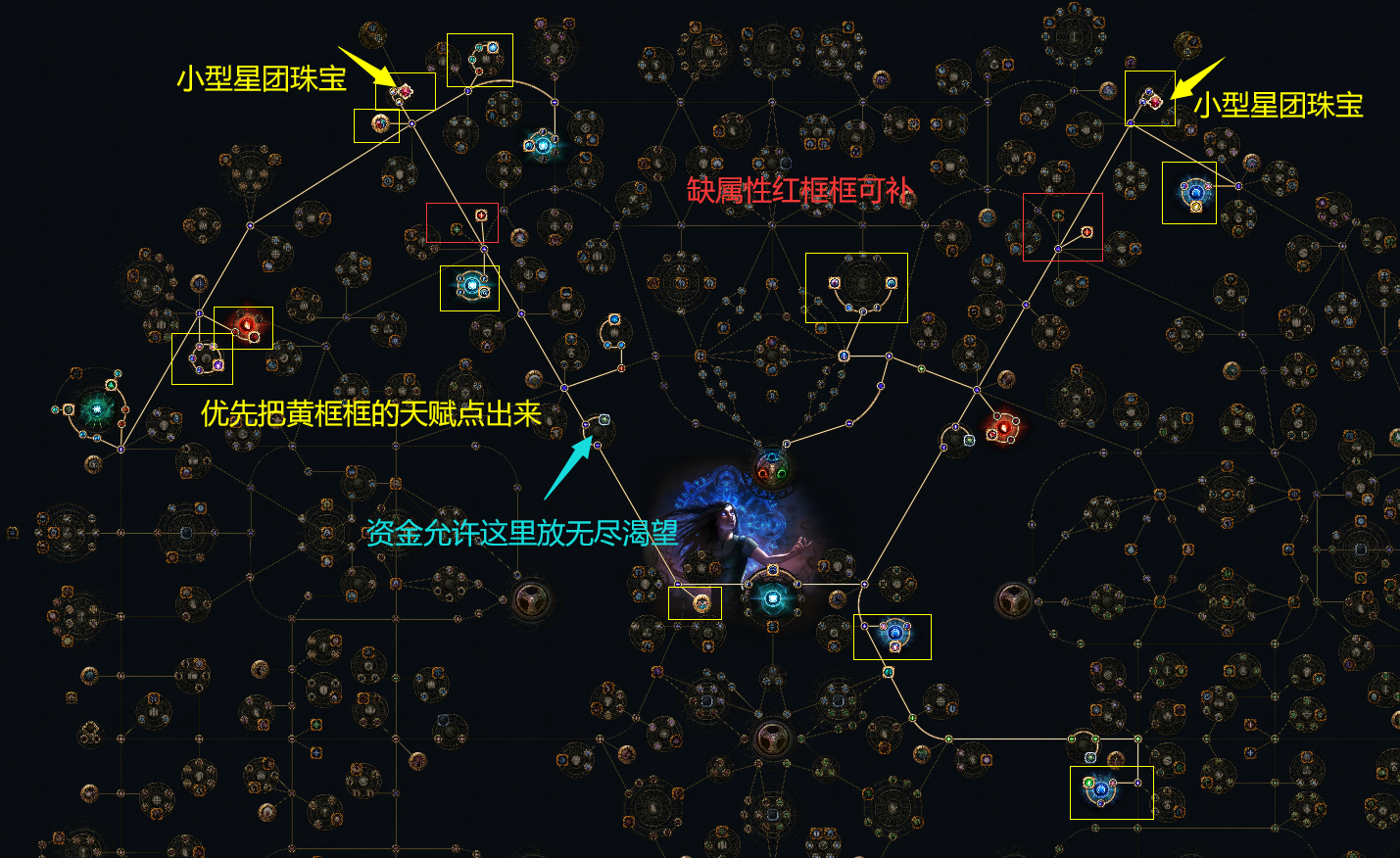 优先把黄框框里的保留效能点出来,保留效能的专精也要优先点出来,缺属性可在红色框框里补