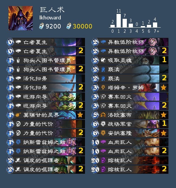 黑眼术再也不需要黑眼,所以我们姑且称它为巨人术1.0。有熔核巨人及活化扫帚的术士是完全不畏惧木工德的6/6的,除非对手硬控血等待场面buff且己方牌序欠佳,否则巨人术士是非常难输给木工德的,巨人配合扫帚是最常见的返场反叫杀手段。力量的代价以及纳兹雷兹姆之触,吸取灵魂等等都无需吝啬,有需要时随时交出即可。