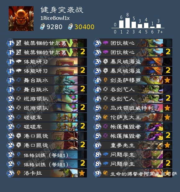 和之前健身战90%构筑都是一样的,区别是现在带上了海盗冲锋一套,港口匪徒可以弥补二费曲线前期过牌,暴风城海盗中期是非常优质的生物,这两张海盗本身都是优质的单卡,加上能让海盗冲锋的重拳先生,非常适合健身这个buff思路,后期可以打出一波可观的冲锋伤害提供后期终结能力。因为有了这一套斩**害,原作者放弃了之前牛头人突袭打伤害的方式,用更直接的方式获胜。其他卡都是之前的常规构筑,突袭战的思路也是和之前一样,中前期靠buff的突袭生物特效站场,返场。(突袭特效三人组巡游领队,碰碰车,团伙核心依然是卡组比较重要的核心组件)后期靠新的海盗体系,红龙,问题学生斩杀。