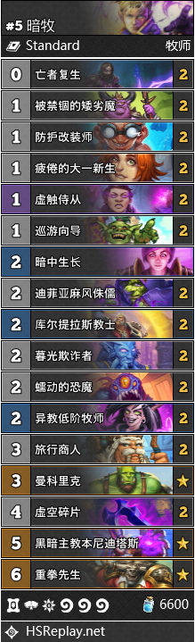 迷你包为暗牧带来了迪菲亚麻风侏儒这一张新卡。虽然这张卡也并不算多么优质,而且实战数据也只能说是平平无奇,但毕竟暗牧可选的组件实在有限,因此目前的主流构筑大多还是选择携带。既然带了麻风侏儒,那么满编虚空碎片似乎也合情合理。而既然虚空碎片可以提供打脸直伤,那么我再带个火车王...呃不对,再带个重拳先生也很合理对吧?需要说明的是,毕竟这是迷你包上线之后的第一期周报,因此我们会更倾向于选择携带新卡的构筑。暗牧确实是目前环境中为数不多的可以考虑携带重拳先生的卡组,但即便如此,重拳对于暗牧来说也绝非必需,甚至未必是最优选择。如果没有购买迷你包的话,可以把麻风侏儒和重拳换成小刀商贩和暗影之灵这样的直伤组件。