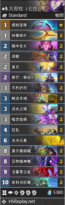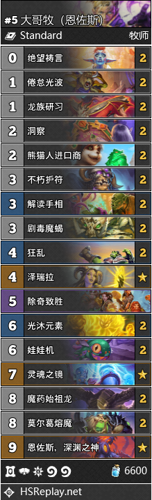 其它牧师形态的实战表现都很糟糕,难以有效上分。不过,如果仅从娱乐卡组的标准来看的话,大哥牧或许还是值得一玩的。他既能为你带来欢乐,也能为你的对手带去胜利,堪称双赢。本期我们为您推荐两款不同的大哥牧卡组,他们的整体胜率基本相当(指同样弱鸡),各位读者可以根据喜好自行选择。不过由于卡组兼具解场,回复和高费大墙,因此稍微能对抗一下环境中常见的快攻德等卡组。这套大哥牧除了大哥+复活+恩佐斯体系之外,在低费曲线上选择了一些类似于传统控制牧的组件。由于不朽护符只能复活亡语随从,因此不必担心兼容性问题。