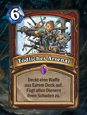 6费法术,揭示你牌库中的一张武器牌。对所有随从造成等同于其攻击力的伤害。