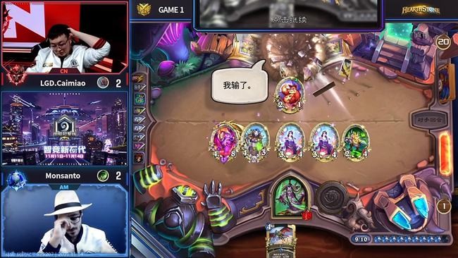 决胜局中, Monsanto果断使用OTK组件解场,转变思路放弃otk斩杀转为利用随从站场叫杀,LGD.Caimiao手牌与场面全线落后,无奈投子认输。