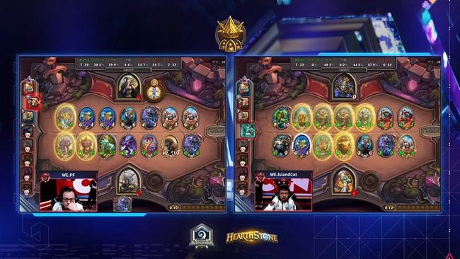 标准与佣兵模式战罢,CN赛区与AM赛区双方比分战成2:2,酒馆战棋模式的输赢决定着哪个赛区能捧起国际冠军杯的奖杯。首局比赛AM赛区前期攻势凶猛,TL.wtybill在7费回合用尤拉朵船长的挖宝技能碰出熊妈妈,TL.Slysssa也早早拿到两张管理者埃克索图斯,导致CN赛区三人迅速被抬,位于后四,好在WE.PF的光牙流派发挥稳定,决赛的时候更是拉满战力,成功击败Collins的野兽流派获得第一。第二局中,AM赛区dog的激素猪流派战力强劲,与队友TL.wtybill会师决赛并夺得第一。