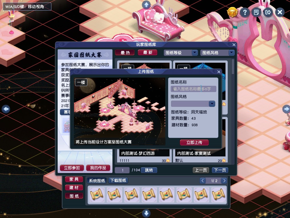当前室内方案设计完毕后,点击设计模式界面右上角图纸大赛入口,进入玩家图纸库,选择立即参加,按要求输入相关信息后,即可将当前房屋中的设计方案作为参赛图纸上传参与图纸大赛。