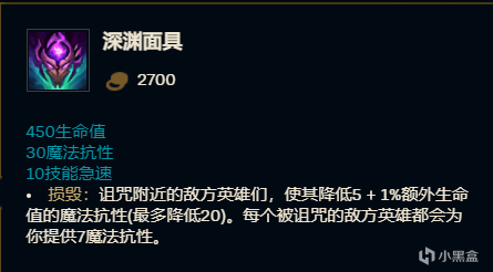 一件开团装备,而且合成路线没有日炎,应该是给开团辅助量身定制的,相应地深渊面具原来的定身加伤害的被动也被换掉了。