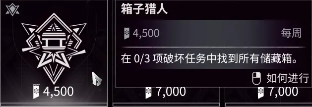 3次破坏任务找到所有白箱子,推荐虚空破坏和清巢,可以刷阿耶精华、刀锋弹舞或者活动电,不熟练的可以去地球找白箱子。