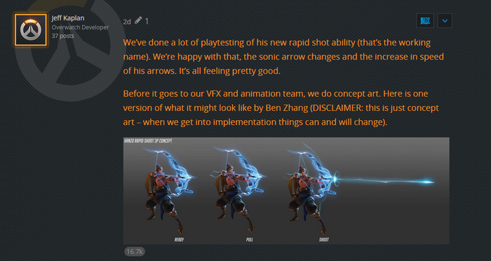 半藏的重做主要面向“散(E)”和“音(Shift)”两个技能,普通攻击、爬墙等核心技能应该不会有太大改动。守望总监 Jeff Kaplan 在官方论坛分享了Shift技能——音波箭的重做方案: