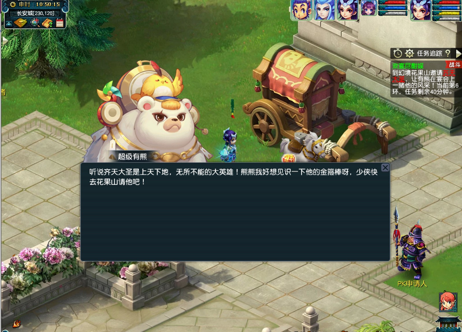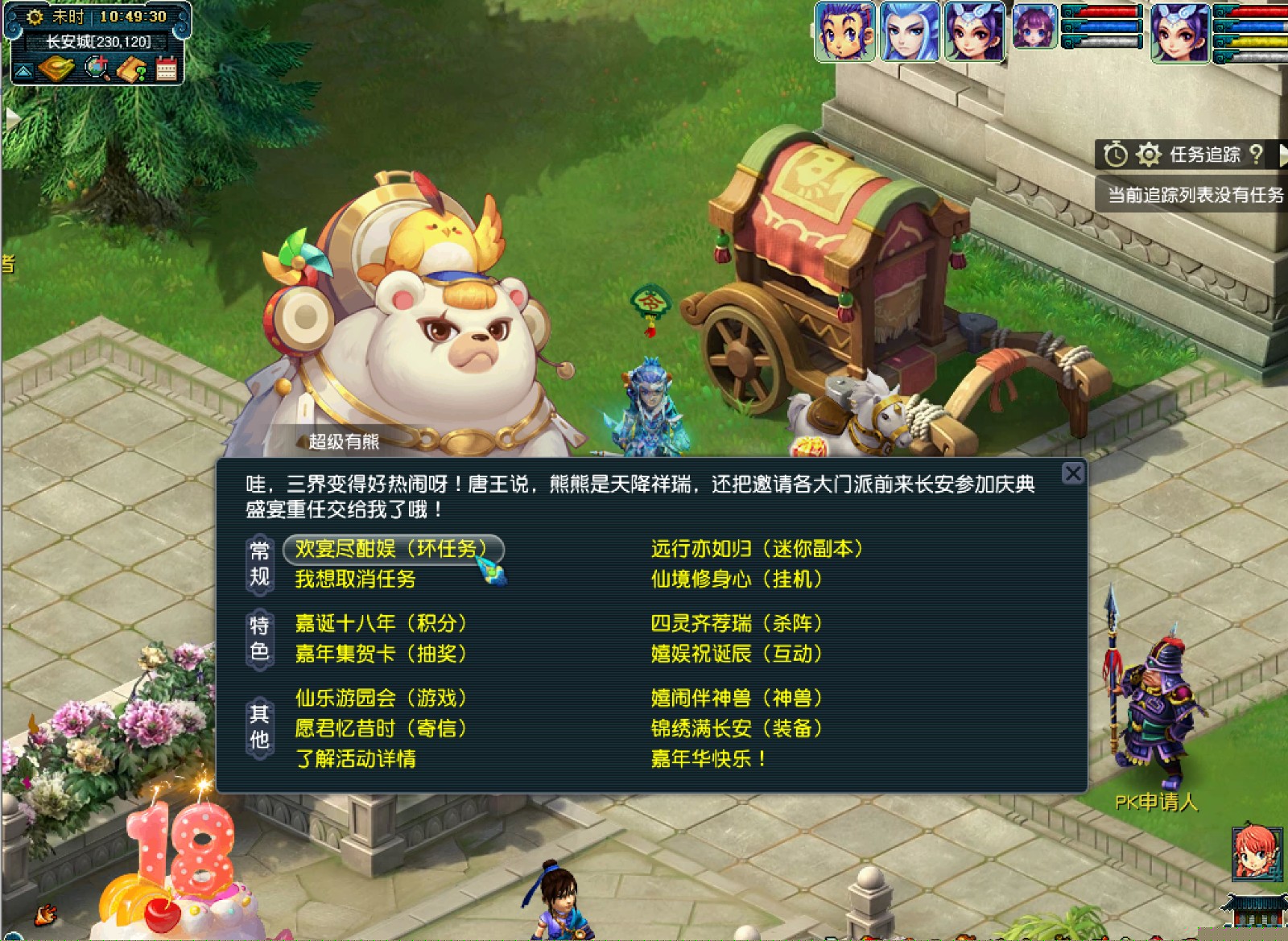 重复领取式环任务。嘉年华活动第二阶段全天,玩家(≥30级,至少3人组队)可在长安城(235,115)超级有熊处领取任务。