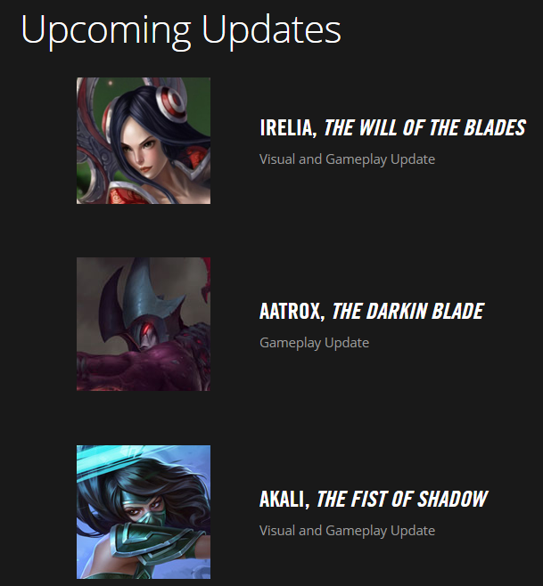 类别更新——Class Update,类别更新在去年季中坦克更新后就取消了,因为设计师发现这种强行将特定类型的英雄一起进行更新,并没有达到满意的效果,虽然他们尝试给每个英雄独特的定位,但并没有真正改善健康的玩法。在过去几年已有的类别更新包括重装战士、射手、法师、刺客、冲阵坦克,在取消类别更新后,游戏玩法小组的设计师将不定期对后续英雄完成更新,但不局限于一个版本中更新。比如去年夏季赛以来对游击战士的几次更新,包括雷克塞、黛安娜和赵信。