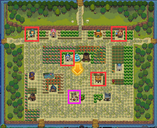 最先升级的建筑:大圣堂,公会管理所,卡妮娜商店,诺顿商店,月光酒馆(也就是图中5个圈出来的地方)。
