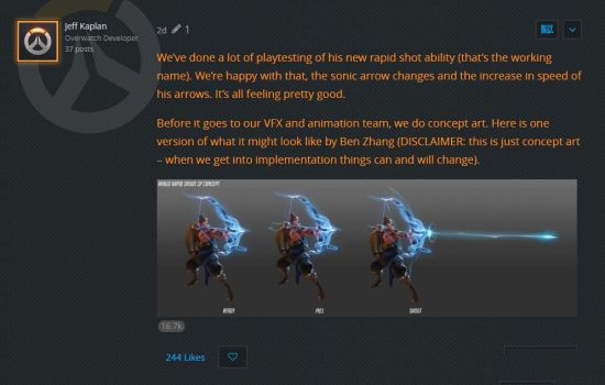 Jeff在回帖中说到:“我们为他的速射技能做了很多游戏测试(速射只是它的工作名称),我们很高兴看到他音速箭头和弓箭射速的改变,一切感觉起来都很不错。在一切交给我们的视觉效果和动画团队之前,我们会制作概念图,这就是由Ben Zhang设计的一个可能会出现的版本(免责声明:这只是概念图-当我们实装的时候,将会,也一定会发生变动)。”