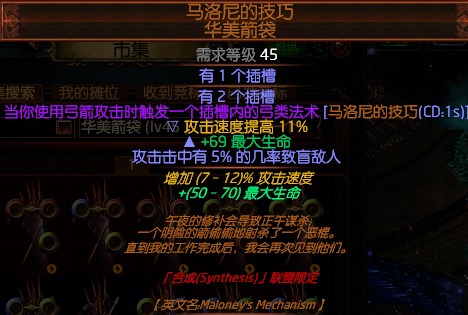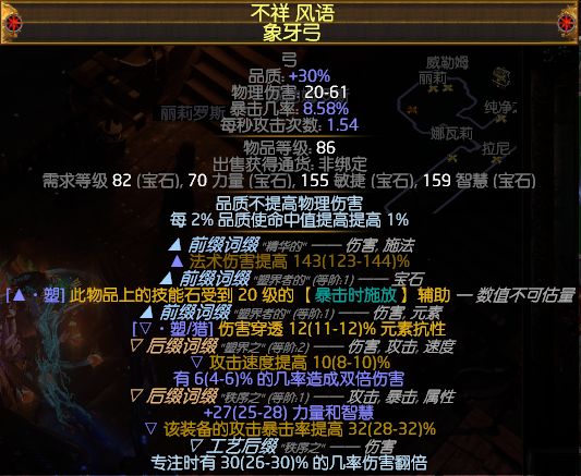 制作方法:选用83物等塑界底子的象牙弓/骨质弓/脊弓,先用完美化石单点出30品质,再使用法伤精华单点,出3条前缀中的两条并空1条前缀即可,工艺台附魔无法添加攻击属性,然后魔物园去后加前(大地巨狼)出第三条前缀,如果失败则剥离/重新点。之所以选用83物等,是因为在去后加前这个步骤可以屏蔽掉一条无用词缀。欧皇精华点出3前缀可无视。