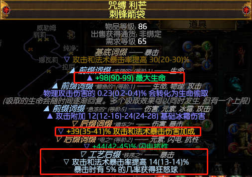 83及以上物等塑界刺锋箭袋,使用暴伤精华点出T1生命并空后缀即可,附魔暴击得狂怒球。
