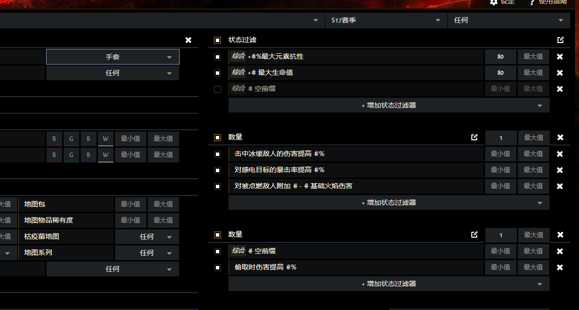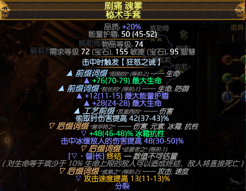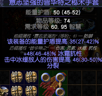制作方法:选择73-74物等带击中冰缓敌人伤害提高(普华特)词缀的非势力手套(丝绸手套最佳但成本过高,酌情),通过魔物园暗夜异蛛等一系列手段弄成下面这样仅含1条普华特+1条任意前缀: