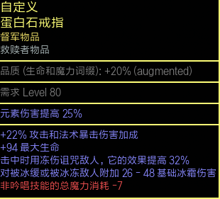 冻伤戒指:80+救赎戒指庄园施法C或以太化石点出冻伤+生命+空一前缀即可,生命越多自然越好,缺抗补抗不用多说。前缀附魔非吟唱减耗(解密戒指隐匿前缀可解锁工艺)。品质打命魔。