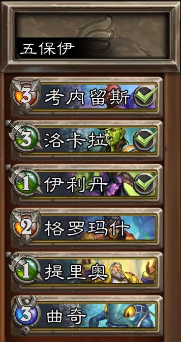 阵容选择——伊利丹(*)、洛卡拉(*)、吼爹(格罗玛什·地狱咆哮)、曲奇、弗丁、考内留斯·罗姆(*)。(星号为常见首发)
