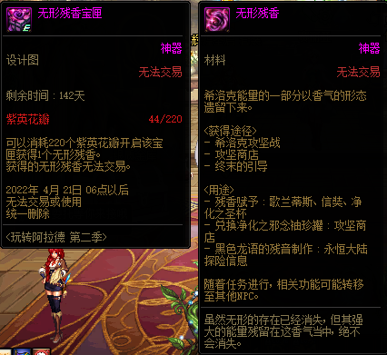 DNF无形残香宝匣介绍:可以消耗220个紫英花瓣开启该宝匣获得1个无形残香,获得的无形残香无法交易。其实就是一个无形残香设计图,使用后消耗220个紫英花瓣获得一个无形残香。