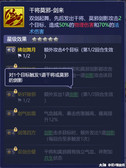 1X:目标被干将和莫邪剑影都攻击过时,额外发出1道剑影攻击该目标