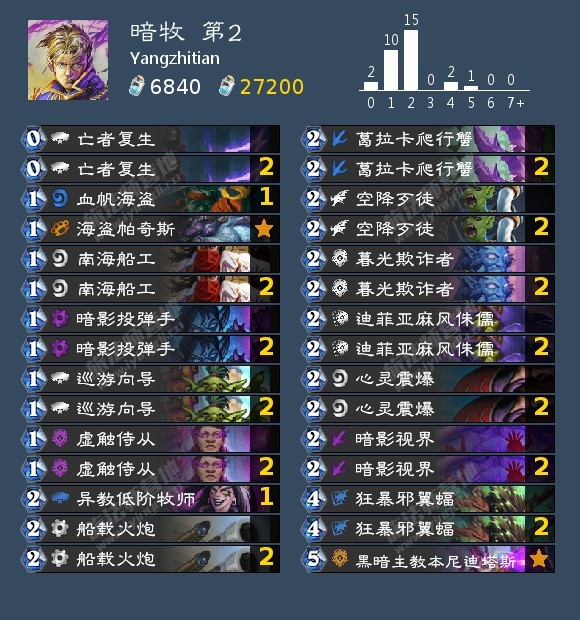 ocram507第5的构筑:-1巡游向导,-1异教低阶牧师,-2暮光欺诈者,+1暗影布缝针,+1血帆海盗,+2暗中生长。