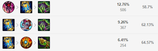 神话装备选择多样,帝国指令能为队友增加输出。大面具则是有后续的灼烧伤害,皇冠能够加速,很好地开团。中娅沙漏能够很好的配合莫甘娜的大招,还能起到关键的保命作用。鬼书可以施加重伤,提升输出。