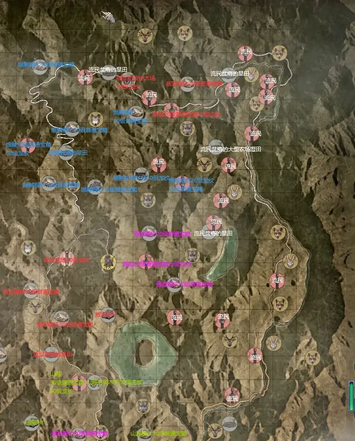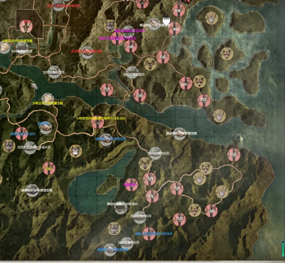 补充一下资源点比如铜铁煤概率会刷和宝箱等级相同的龙纹但不是必刷 大型据点稀有宝箱为龙纹等级的宝箱 图上为必刷点这个该清晰一点