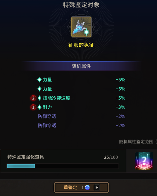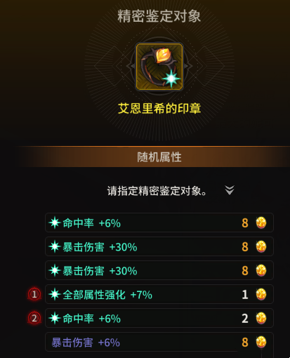 使用精密的薛定谔鉴定石锁住其中一个垃圾词条进行调整,注意:此时选择一条属性使用精密的薛定谔鉴定石,原属性会被调整。如果点击应用了,新属性会覆盖原属性,该属性就被锁住了,左边会出现一个红色的数字编号,有数字编号的属性无法使用特殊的薛定谔鉴定石调整。如果选择后退,属性不会改变,也不会出现数字编号。