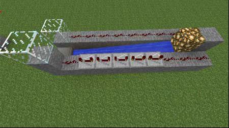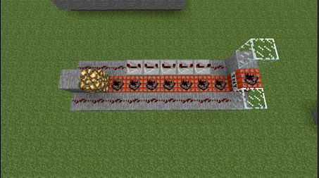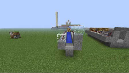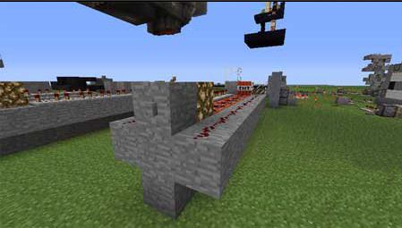 3. 左边的一侧红石和红石中续器是点燃炮弹TNT的!所以红石中续器是控制炮弹的爆炸时间,调得越低飞的距离就越低所以大家可以利用这个来控制射程,当然你也可以利用 放置推力TNT的数量来控制