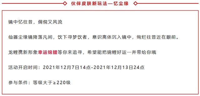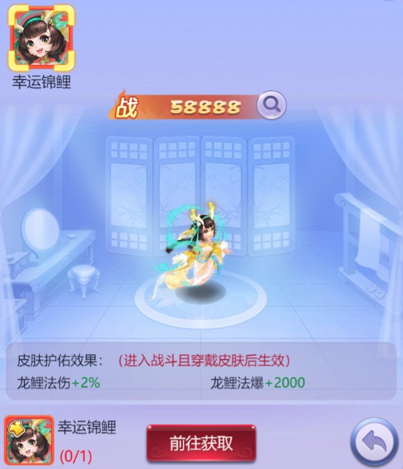 这次限时上线的是红色伙伴龙鲤的红色品质皮肤“幸运锦鲤”,额外增加58888战力,带有皮肤护佑效果,穿戴后可使龙鲤法伤+2%,法爆+2000。