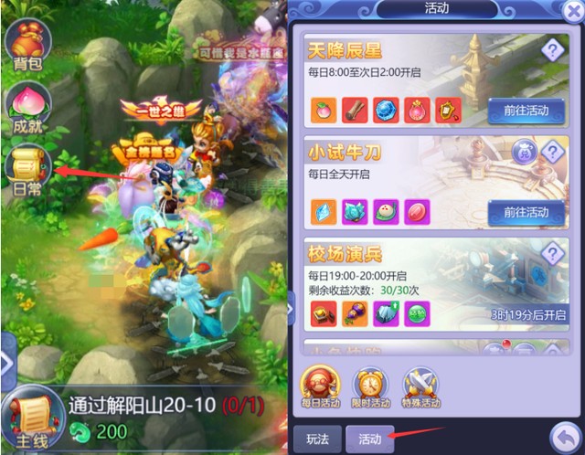 少侠们现在需要前往挂机界面左边的日常界面查看活动内容。