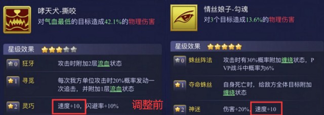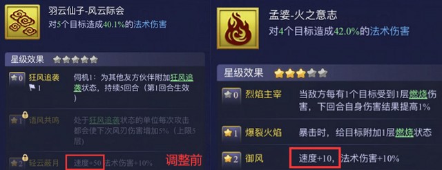 解读:调整前,羽云仙子、孟婆、玉面公主、哮天犬、铁扇公主、情丝娘子这6位伙伴的2星技能具有加速效果(仅针对具体伙伴生效的),出战时需要注意这几位的配速问题。