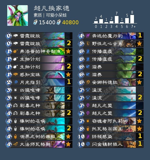 卡组本身比较完善,只加入了新卡野性之心古夫。我觉得不能单纯去把这张牌看作是5费成长叠甲,它还有很多内涵,比如不吃封魔、能把跳费后的上限储存起来,在一些比较极端、被游荡恶鬼、被脏鼠的对局里还能提供多水晶启动方式。