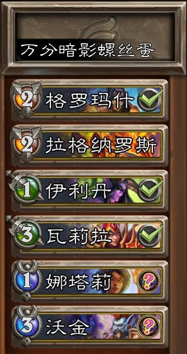 阵容选择——格罗玛什·地狱咆哮(2技能加伤)、拉格纳罗斯(免冻结+加血)、伊利丹(1技能加攻)、瓦莉拉(潜行加速)、娜塔莉·塞林(1技能加伤,此装备可考虑装备3翻牌子)、沃金(暗影加速)。