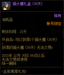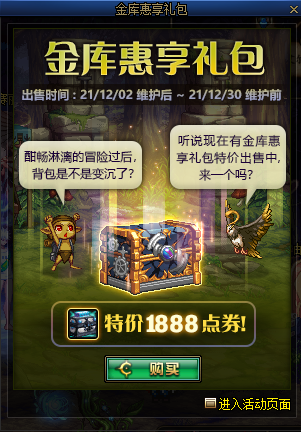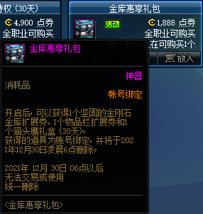 金库惠享礼包售价1888点券,无法使用代币券,限购1次。开启后可以获得【坚固的金刚石金库扩展券】、【物品栏扩展券】和【30天猫头鹰】