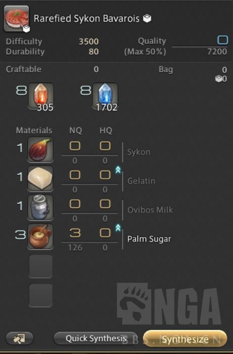 紫票:同样是厨子,材料是1个87级非限时材料(Sykon);明胶(商店货);1个双色材料(牛奶)和3份你在雇员练级过程中或采集过程中会拿到的棕榈糖(82级非限时,6份糖浆搓3个)。相比其他职业动辄8-16个双色(说的就是你制革),需要重复二次加工素材(比如铸甲)好很多。