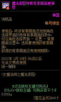 DNF魔法家园特殊背景画面更换券使用后,将改背景画面添加到角色选择界面的特殊背景画面目录中。可在角色选择界面、设置、背景画面设置中,选择要使用的背景画面。