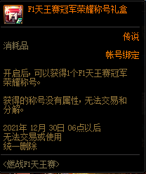 DNFF1天王赛冠军荣耀称号礼盒开启后,可以火法1个F1天王赛冠军荣耀称号。获得的称号没有属性,无法交易和分解,就是一个幻化外观,是仇东升F1天王赛夺冠的证明。