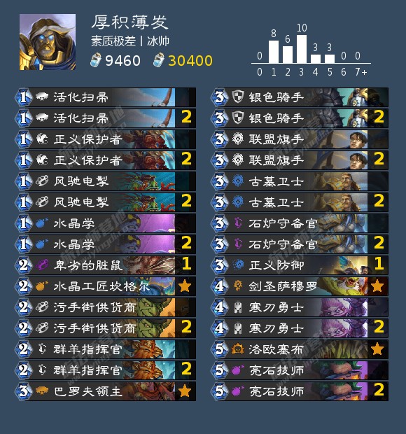 这版本骑士倒是得到了诸多补强,特雷克塔尔对于全封骑来说是加强版战斗号角,深铁穴居人也可以作为一费曲线来恶心任务卡组,贴个buff更是血赚。污手骑的加强更多,石炉守备官、群羊指挥官和血色骑士赛丹都是朴实无华的补强,因此出场率更高。只不过贫瘠之地的几刀让骑士伤筋动骨,目前还难以重返巅峰。