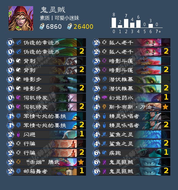 新版本天梯还是以鬼灵贼为主,虽然中立新卡伏兵和反射工程师都很克制鬼灵贼,但是因为鬼灵贼数量不多,并没有成为主要针对对象。冷齿雪人作为三费的雪人,可以在奇数贼抽不到荆棘帮暴徒的情况下,给予场面压力,不过也就那么回事,只能说奇偶卡组越来越不适合版本了。另外高分段还有带双大范和重拳的奇迹贼,只不过操作难度较高,也比较小众。