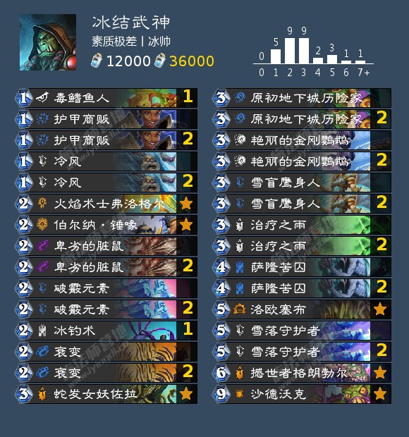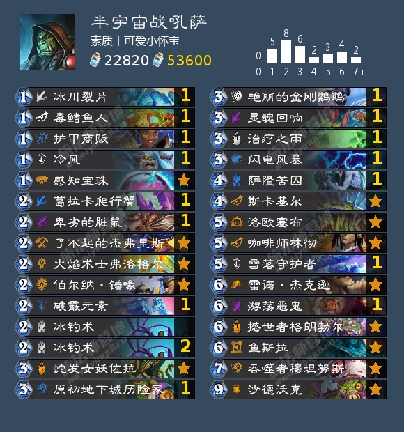 这套没有带换技能,因为本身奶和甲都足够多,打铺场快攻奇数猎和术士都是小优,换技能还会影响我们检索火毒清场一套。卡组没有带洛克霍拉的使者,因为冰帅觉得435过一张牌并不算强。卡组也没有带活化龙息等内卷卡,构筑中规中矩,追求自身强度,由于战吼萨的构筑并没有完全成型,这套仅供大家参考。