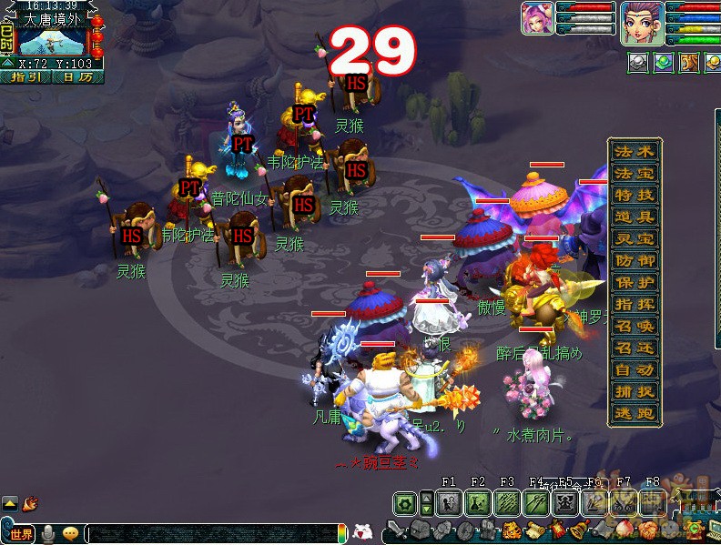 固定门派TG,固定使用天雷斩、水漫金山或平砍。