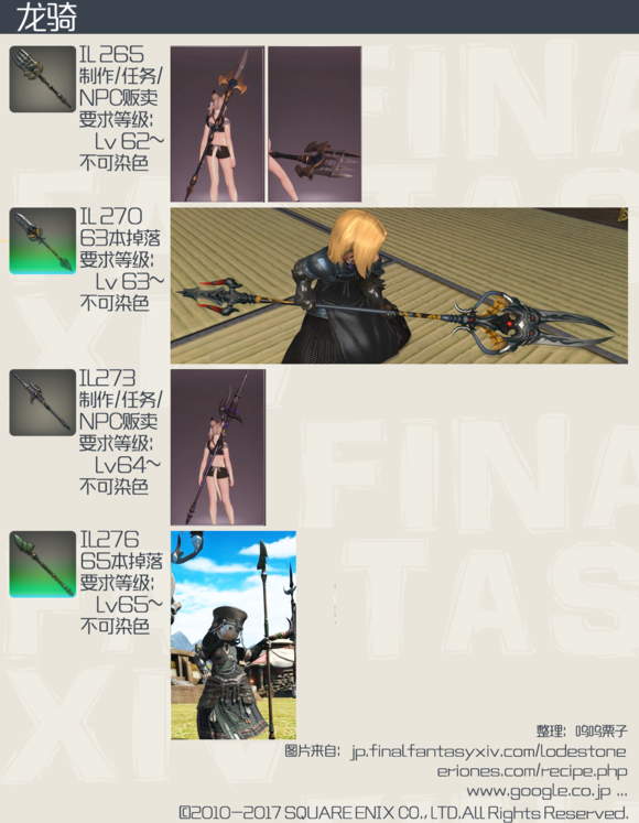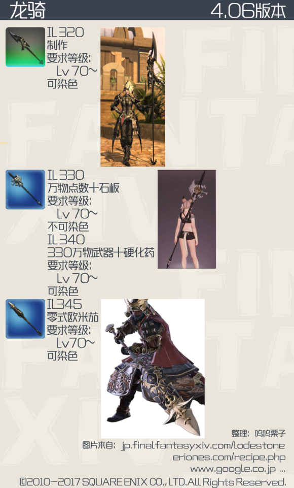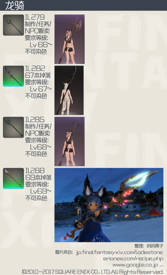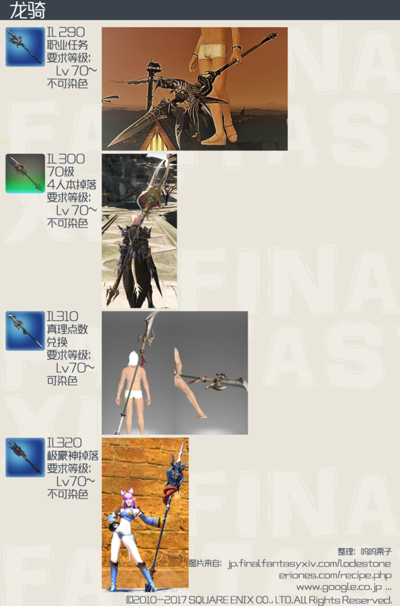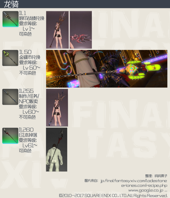 被玩家戏称为“后妈生的”龙骑,在此次版本中依然没能得到帅气的武器,本来长枪这种武器的模型最容易做的狂拽炫酷中二满满,不过FF14的美工似乎一直对龙骑不够上心,让我们一起来看看4.0龙骑的武器外观吧。