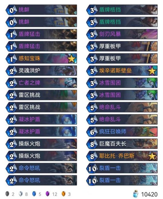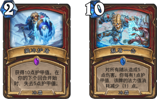 不得不说,新卡凝冰护盾和裂盾一击真的太好用了,2费10护甲5点AOE,前中期能抽到两套,拖住肯定就没问题了。我有一局打快攻骑,愣是把他给解空牌库了,他才不爽地投降了。冰雪围困也不错,这是我自己加的,配合战士的雷区挑战、操纵火炮、剑刃风暴或者武器可以轻松拖回合数。
