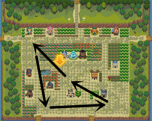 在城镇内,与像素守护者(下图黄色箭头处)对话。完成后再分别与像素女鬼剑、暗夜使者、女枪手(NPC的相对位置在下图)对话,最后再回到守护者处完成对话。