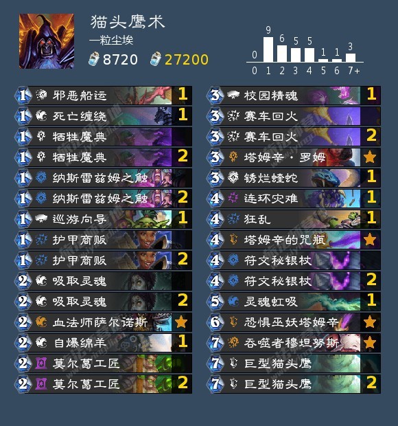 猫头鹰整体的构筑应该是大差不差的,斩杀方式是送掉一个猫头鹰+几次交易后的邪恶船运+塔姆辛的咒瓶(有必要的话可以再配一次罗姆)然后用校园精魂解掉自己的场面打出超高额伤害,我觉得这套牌能打出不错成绩我们更需要学习借鉴的是单卡的选择。