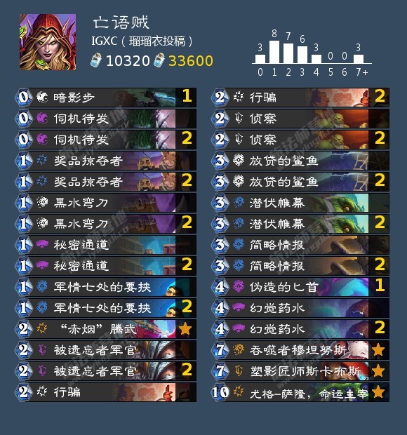 这卡组怎么赢比较玄乎,我玩了7,8局左右感受了一下,总体好像是靠导演这个不稳定的点获胜。因为简略情报配合鲨鱼体系可以创造很多额外的硬币,配合伪造的匕首或者把鲨鱼送掉可以获得大量费用。这样就有机会提前开通道去找尤格萨隆或者英雄牌。在对阵萨满这样吃key牌随从的卡组时,也可以有机会打出下图的效果,用吃手手配合幻觉药水打出这样的效果。