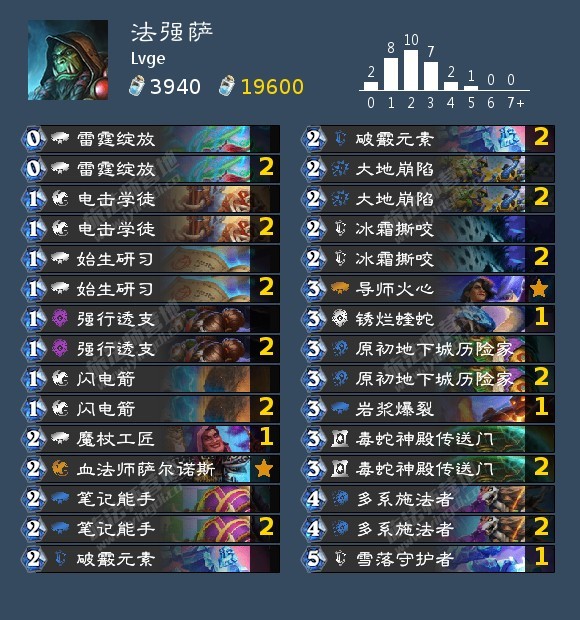 这个版本萨满职业卡的整体质量都比较高,搭配上之前就有的法伤的底子就可以组出这样一套偏中速的卡组。整体思路是用笔记能手配合花呗或者直伤牌过载较多水晶,然后用强行透支打出一波高的爆发,这个过程配合法强生物很容易就能打出15+的伤害。因为这个卡组和永恒之火的思路不搭配,所以火焰法术lvge选择了岩浆爆裂,这样依然是可以凑齐四系(自然奥术冰霜火焰)每次写萨满卡组都要夸夸这个多系施法者,正是因为有这张高效过牌在,萨满这个靠直伤的思路才能成型(新版本补的冰风也至关重要)雪落守护者只带了一张,用来解决一些复杂的场面,同时反手站一个雪落守护者也有一定概率抢下对手的血量。
