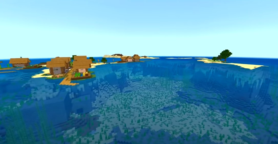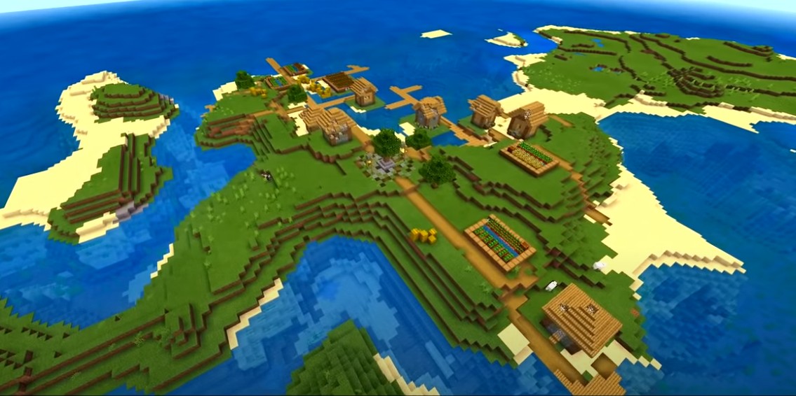 这个地图相比于前面的就没什么亮点了,算是中规中矩的一个岛上村庄,不过它的水平位置较高,有深厚的根基,玩家可以深入地下挖矿,或者是建造一个巨大的-1层,在里面进行各种各样的活动,而且这个岛周围的海水也较深,玩家可以在海底作一番文章。种子:2034402240