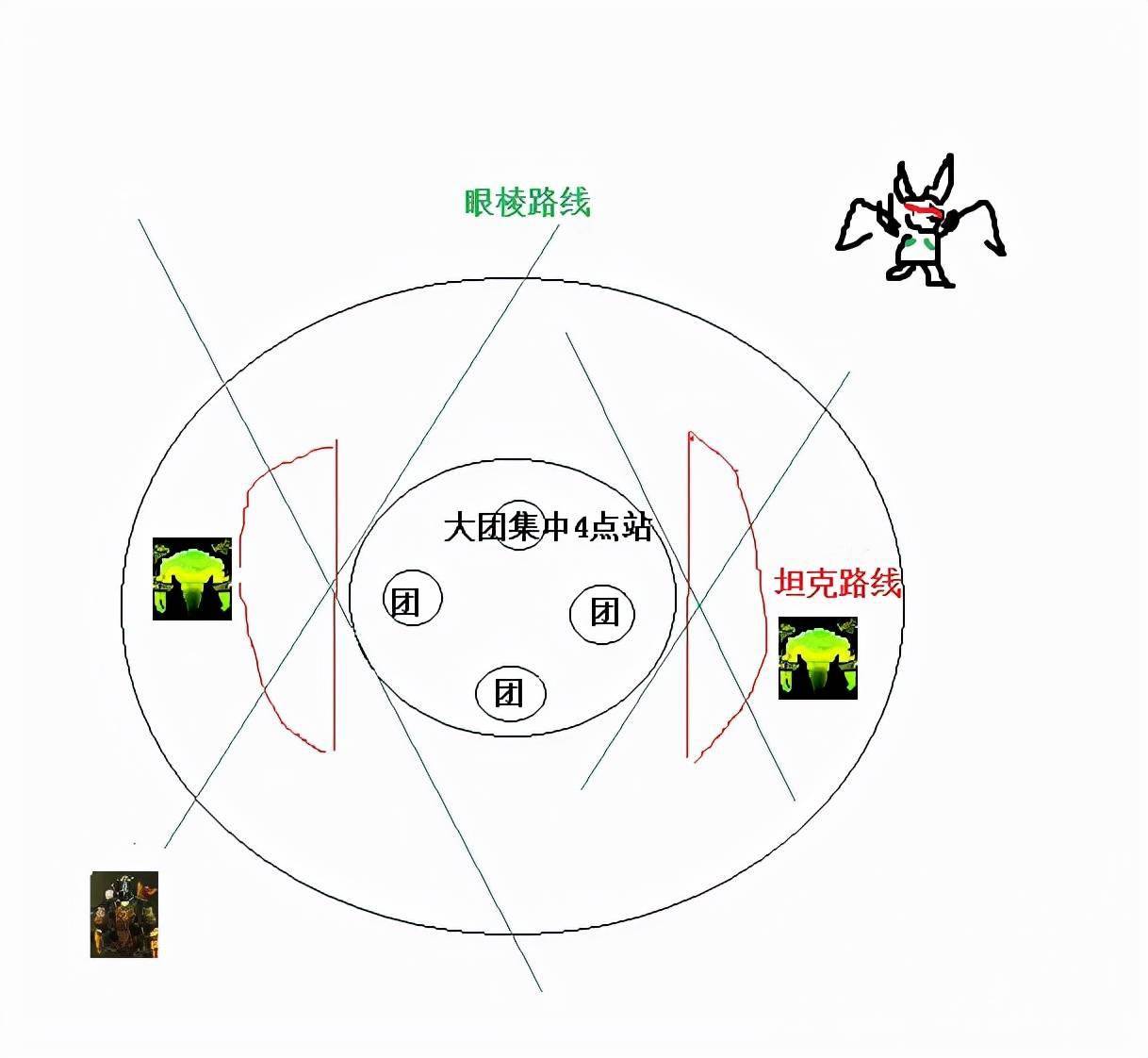 直接画了张图一目了然,4根绿线是眼棱路线,红色路线是火抗T路线。